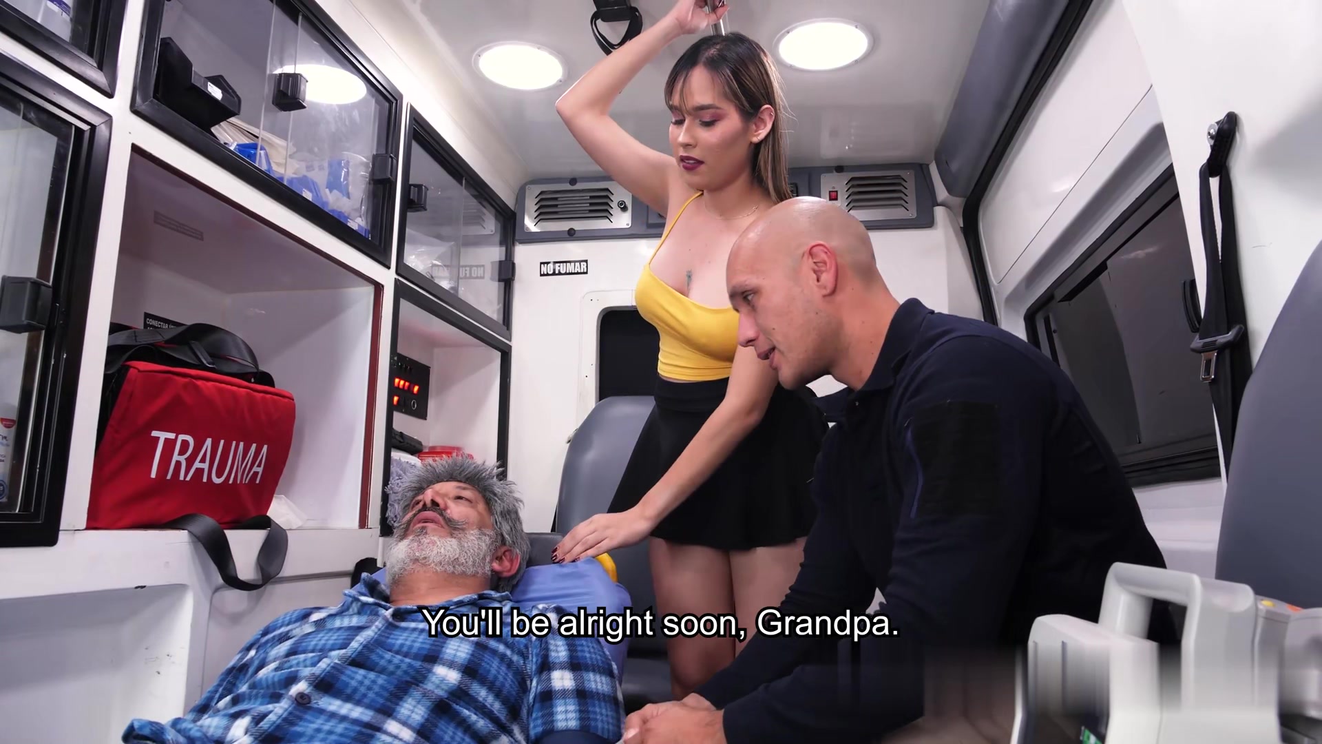 救护车上被男护工引诱在昏迷的爷爷身边让她暴操肥屄到胸射的巨乳女郎
